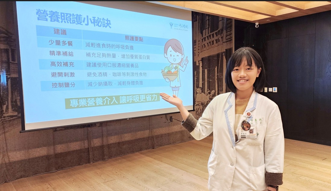 奇美醫院營養科營養師林姿言表示,慢性阻塞性肺病營養照護掌握「少量多餐、精準補給、高效補充、避開刺激、控制鹽分」五大原則,透過專業營養介入,幫助病人減輕呼吸負擔,提升體力與生活品質