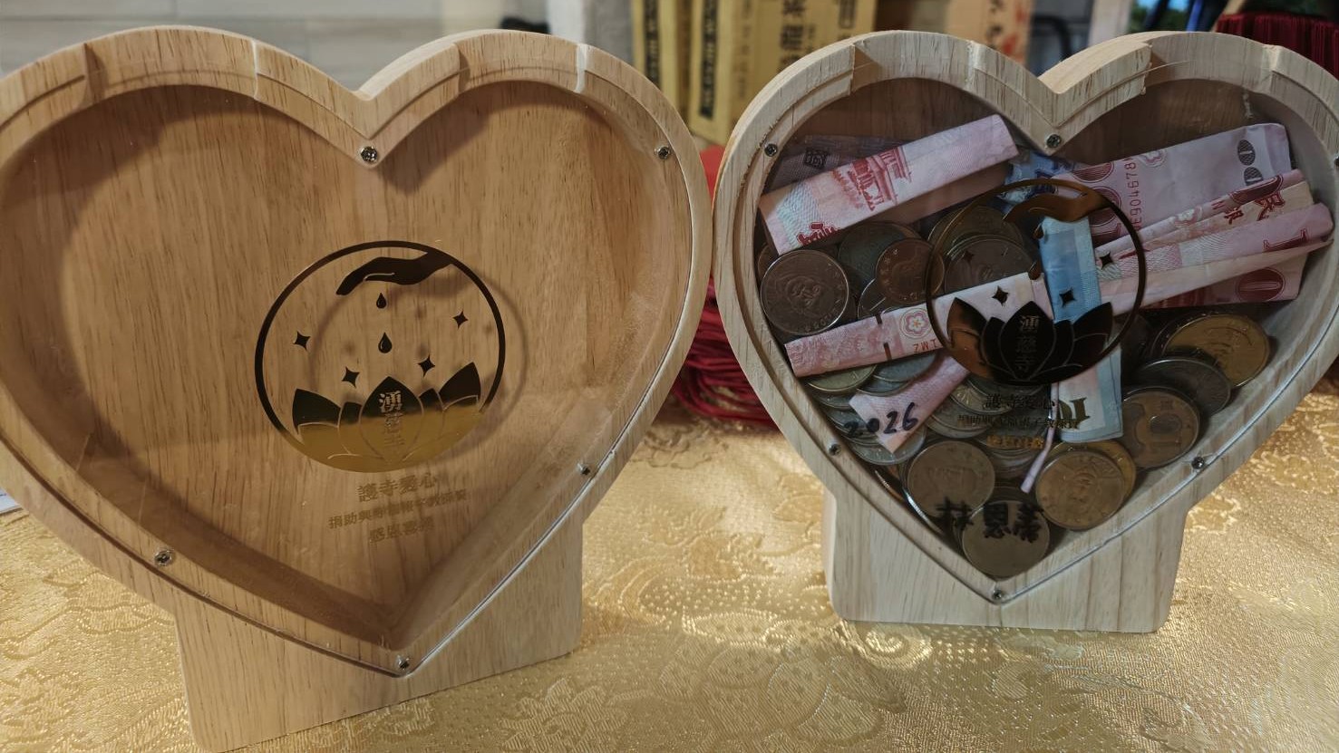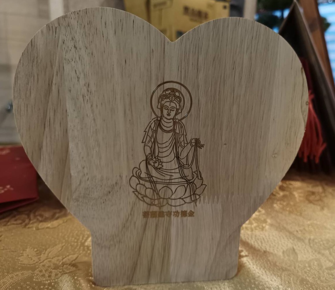 此「菩薩建寺功德金」撲滿是以木材製成,以愛心為造型,正面為湧慈寺的圖騰,並寫上「護寺愛心」等字,背面則有觀世音菩薩的神像,放在家裡可存款及保佑,撲滿存滿可拿到目前位於台南市安平區府平路560號捐贈,捐贈時不用打破撲滿,錢拿出還可以再運用。